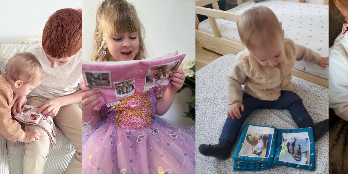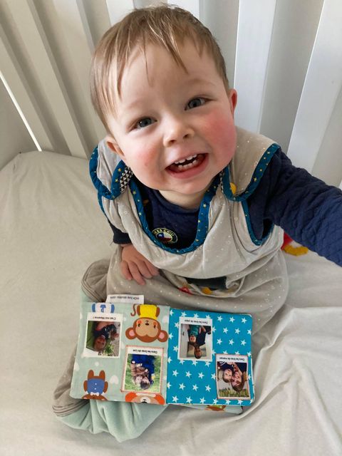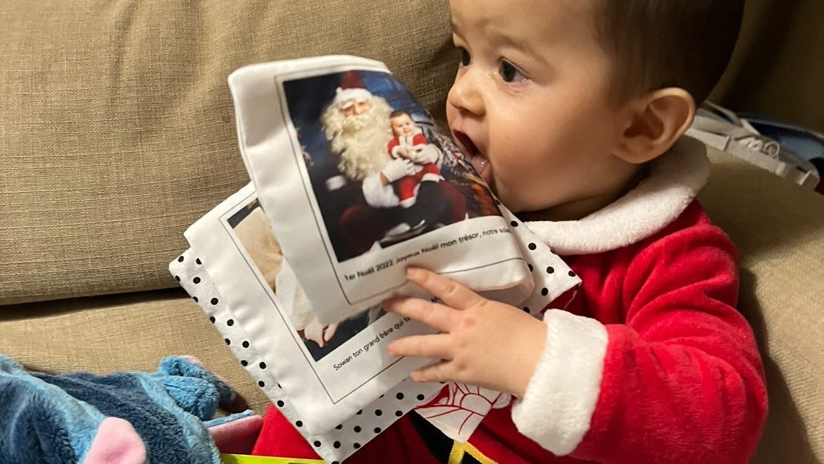 mOn livre doudou est 100% en tissu cousu, et cela change tout. Pas de pochette plastique , pas de photos collées trop faciles à arrache, pas de scratch qui abime les pyjamas…