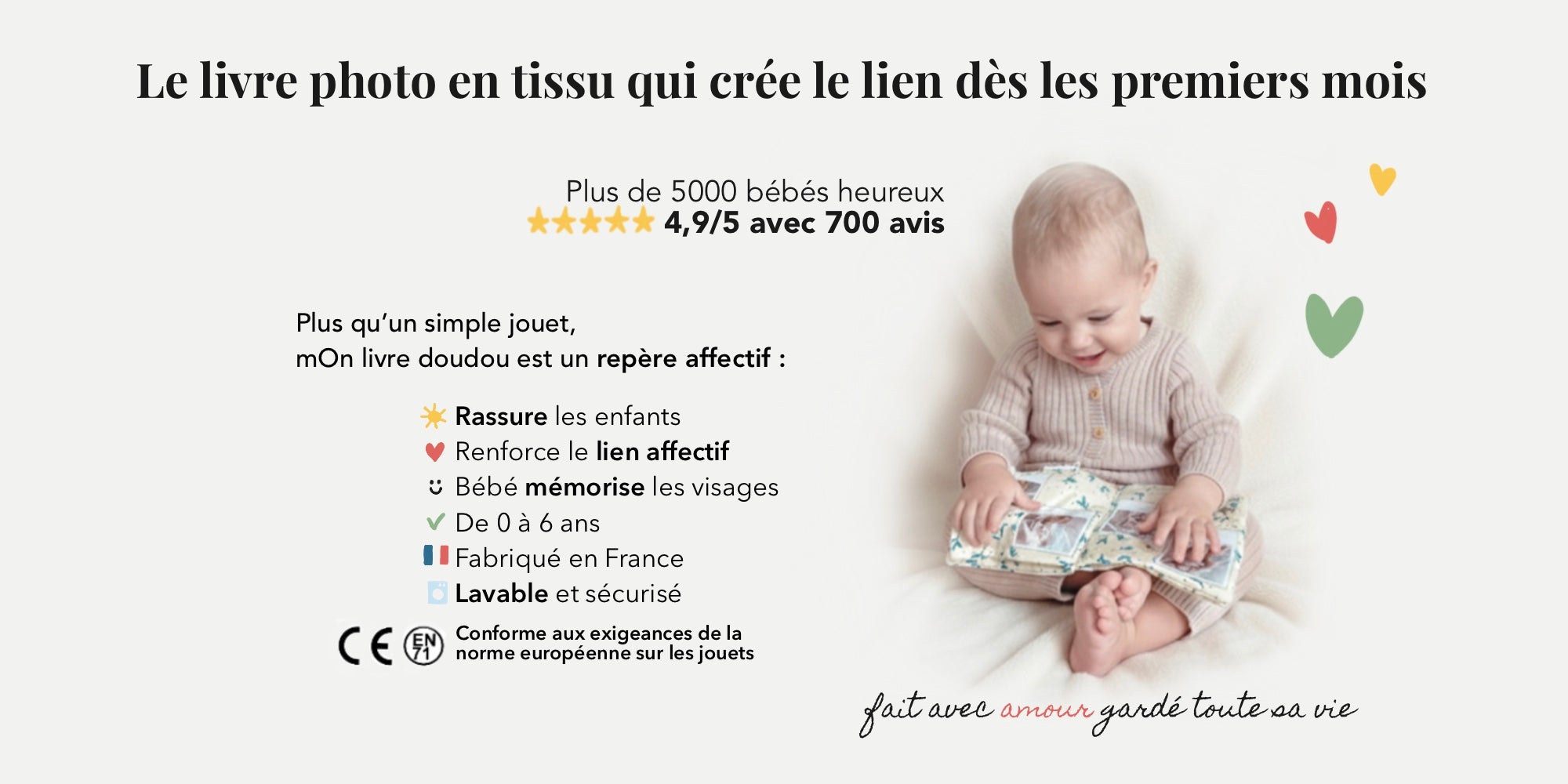 2. Qualité et sécurité : mOn livre doudou est conçu et fabriqué en France, avec des matériaux sûrs et de qualité, respectant la norme CE pour les enfants.