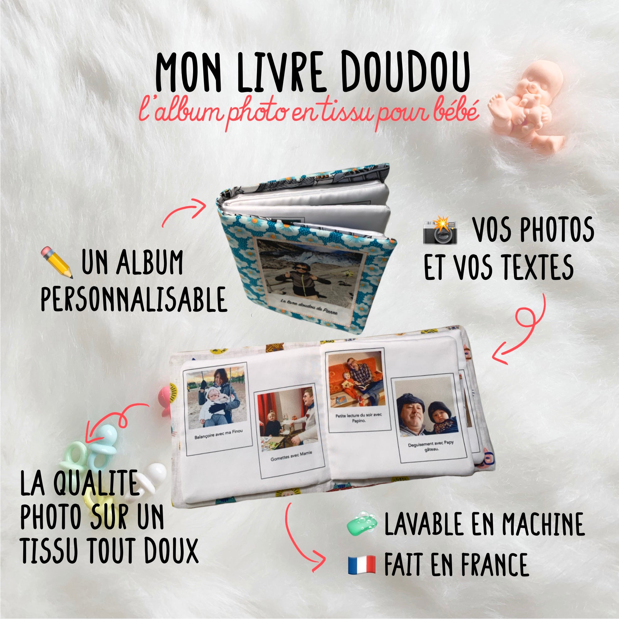 mOn livre doudou est 100% en tissu cousu, et cela change tout. Pas de pochette plastique où on glisserait des photos (aussitôt retirées par bébé). Pas de livre papier que bébé ne pourrait pas manipuler sans déchirer (bye-bye le livre photo tout neuf). Pas de photos collées trop faciles à arracher. Pas de scratch qui abime les pyjamas…